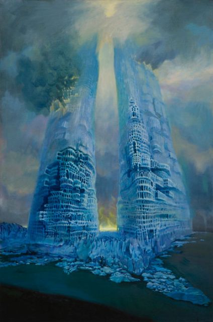 Одна из его ранних картин называется “Кто зажег нас” – свечи в форме зданий, тающие в центре города.