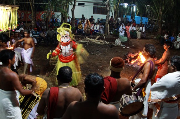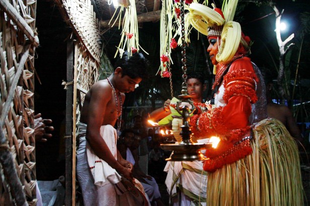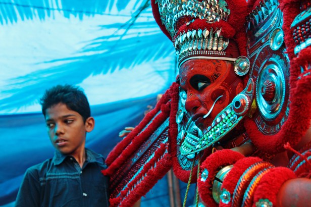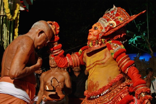 Керала не производит впечатление территории, где людям свойственно нарушать законы физики — напротив, это единственный, пожалуй, штат в Индии, где повседневность более-менее понятна непривычному европейцу; а заодно и самый образованный, и самый экономически стабильный. Однако южный индуизм — особая песня, он сохранился в неизменности, подобно этакому аксолотлю духа, со времен, когда грань между религией и магией была в индуизме тонка до мономолекулярности (не скажу, чтобы и сейчас ее можно было прочертить маркером — разве что тонким пером). Это и жертвенные ямы всесожжения, и медиумы-величаппаду, и геомантия, и столь популярная нынче среди приезжающих сюда туристов аюрведа, и в первую очередь — танцы живых богов, тейямы.